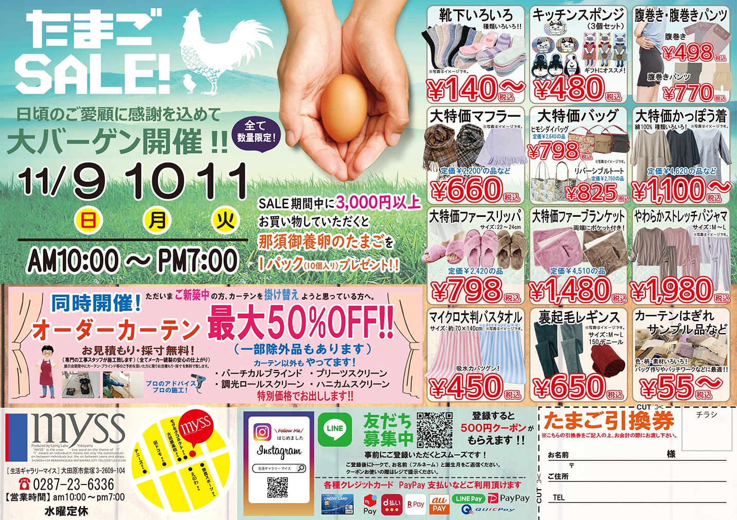 たまごの値上がりにともない、今年はセール期間中に3,000円以上お買い上げで〝那須御養卵”のたまごを