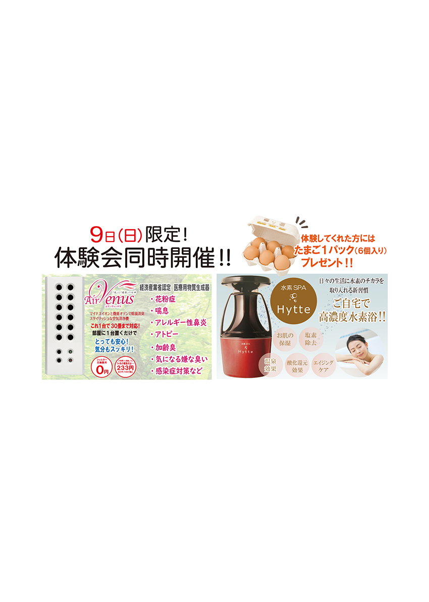 ご自宅で高濃度水素浴ができる水素スパ「ハイッテ」の体験会も開催します!