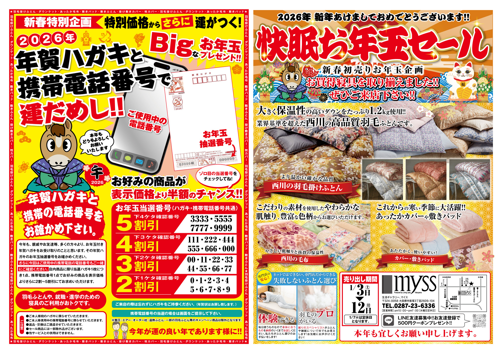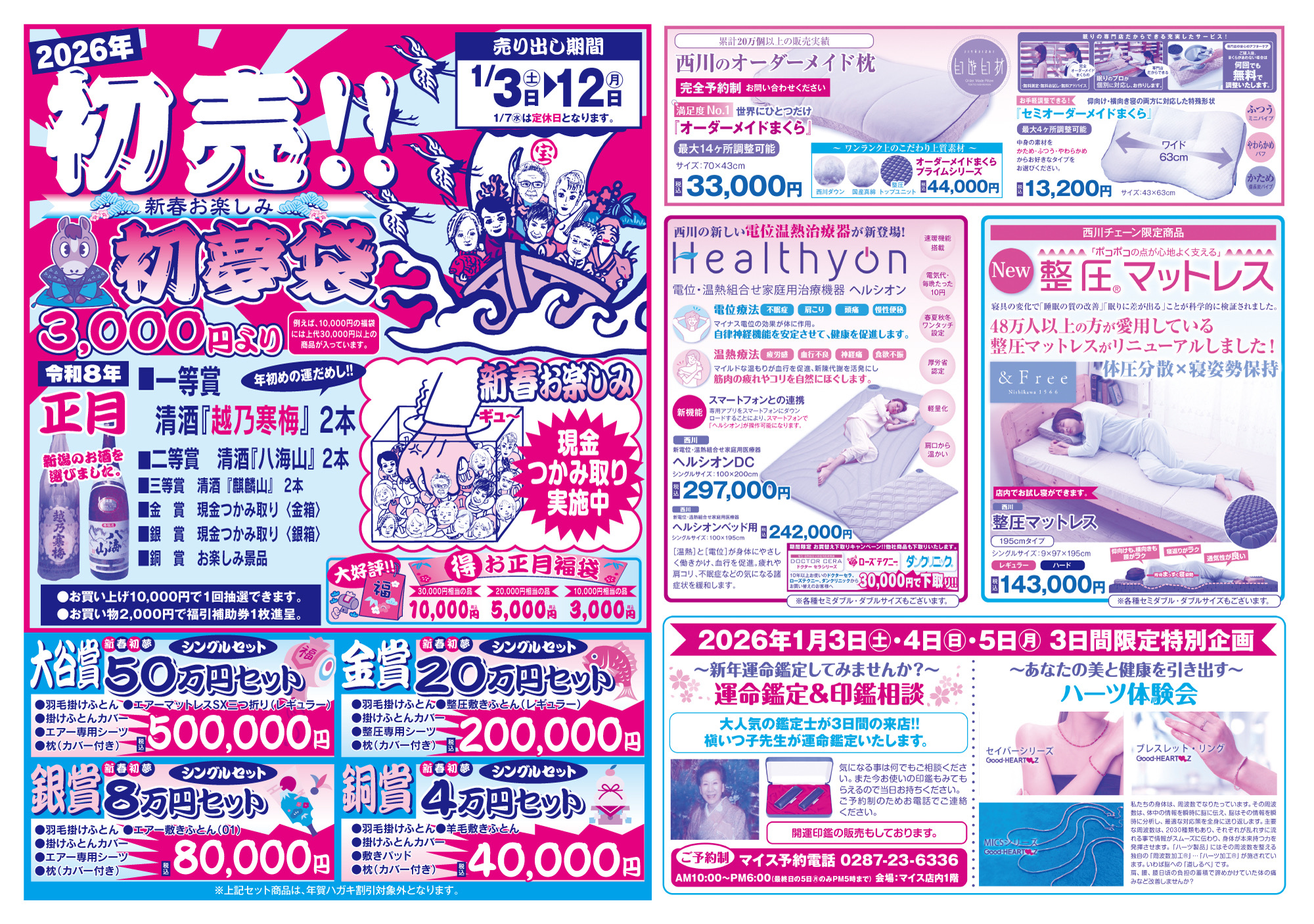 年賀ハガキと携帯電話番号で、半額のチャンス! お酒や現金つかみ取りなどが当たる福引や、毎年大好評の福袋もございます。
